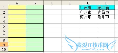 1、在表中输入需联动下拉选择的信息,如图所示(其中省份是一级下拉选项,市名是二级下拉选项):