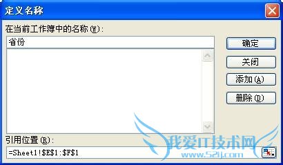 2、选中E1:F1单元格,选择“插入—名称—定义”,输入名称如“省份”,如图所示: