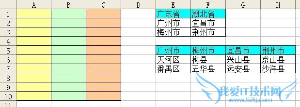 1、在表中输入需联动下拉选择的信息,如图所示(其中省份是一级下拉选项,市名是二级下拉选项,县名是三级下拉选项):