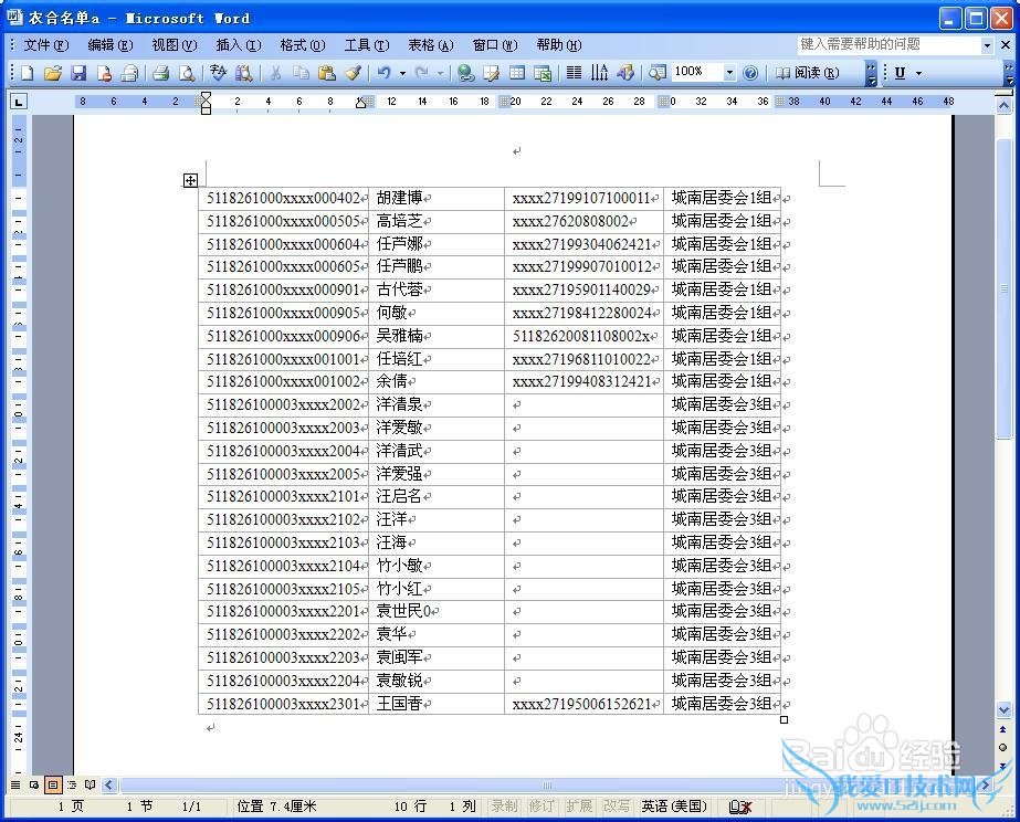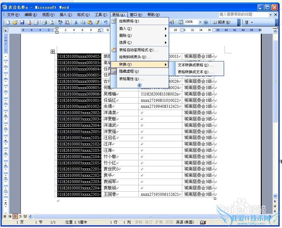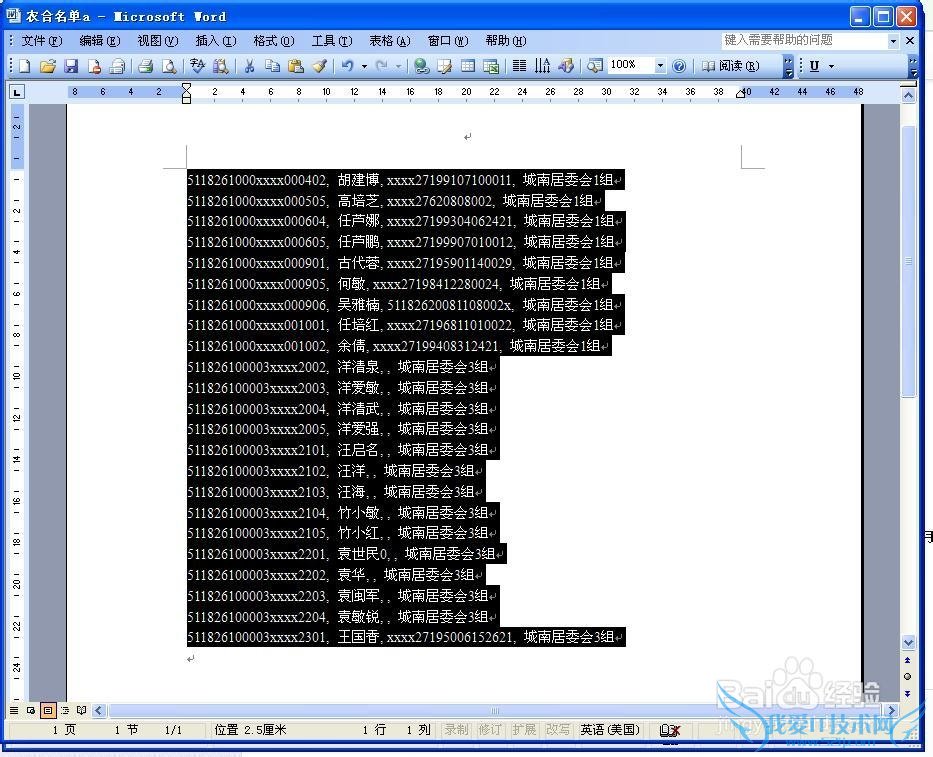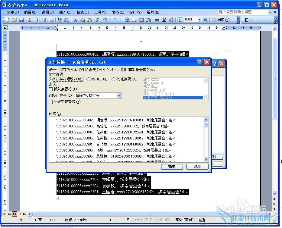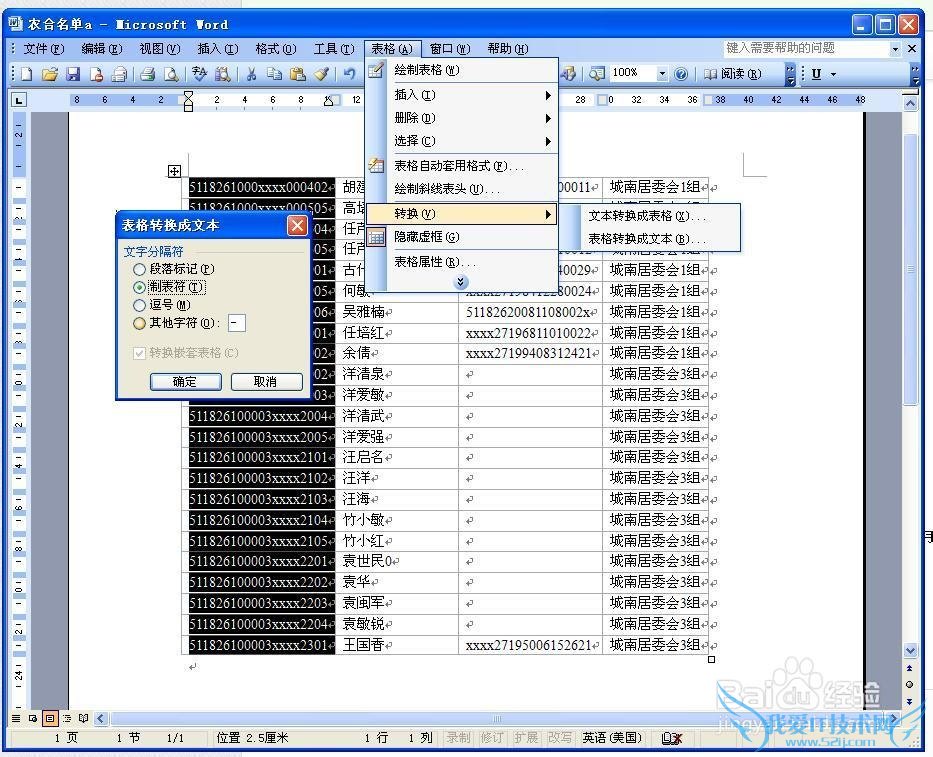 出现表格转换文本对话框,单选为逗号分隔,当然如果逗号和表格中的内容可能有冲突,就选择其他字符以避免表格中内容造成迷惑。我这里表格的内容比较清楚,1列身份证好,2列姓名,3列序号,4列是地址,都不会出现逗号,所以我选择转换后用逗号分隔。表格中内容为空的依然被逗号分隔出来。。以下是转换后的情况。