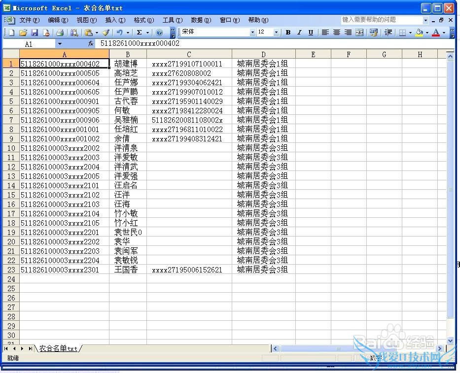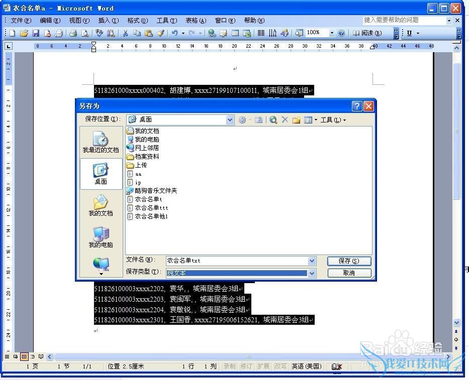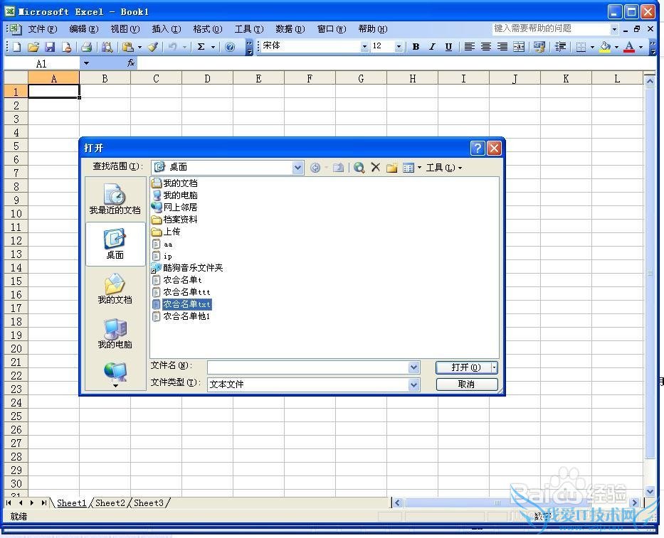关闭word,打开execl。execl中打开文件,选择打开类型为文本文件。如上图图操作。“农合名单txt”是我刚才定的文件名。