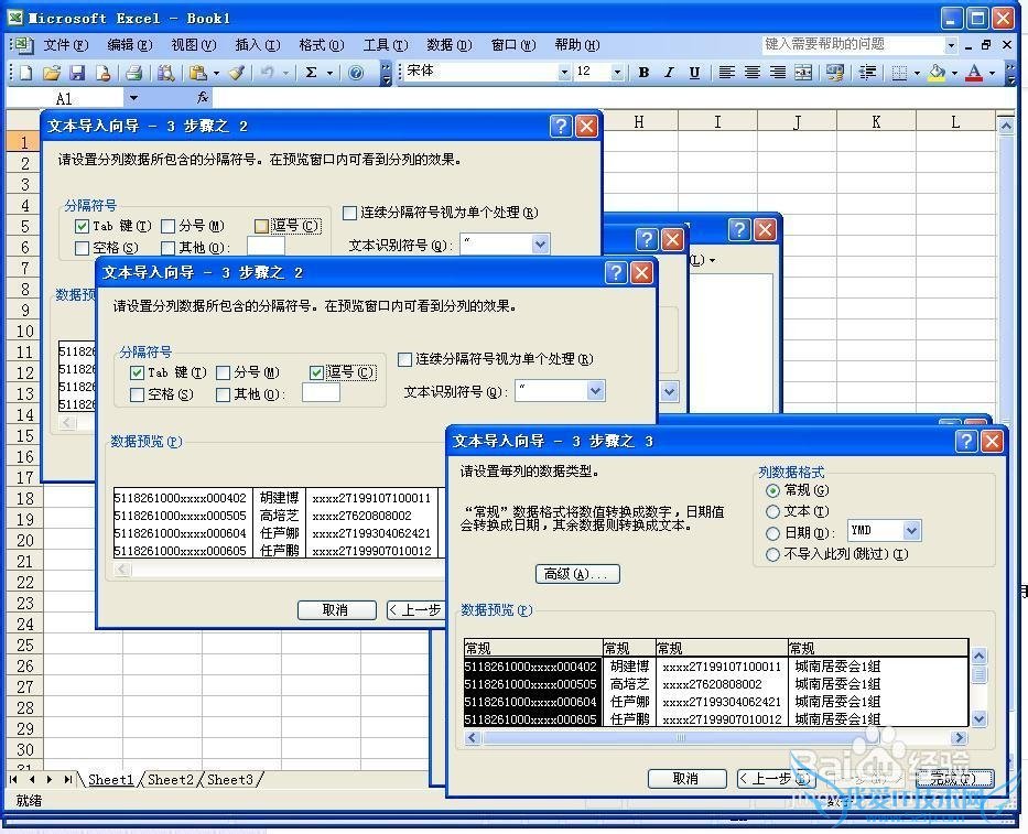 选好分隔符,以及分隔符的一些规则,下一步定义列的数据类型。文本数据比较好复制了数据所以建议,在你不完全明白列数据格式的含义时候,都选择文本格式。以防身份证号之类的数据被科学计数法弄乱了。。设置完成。