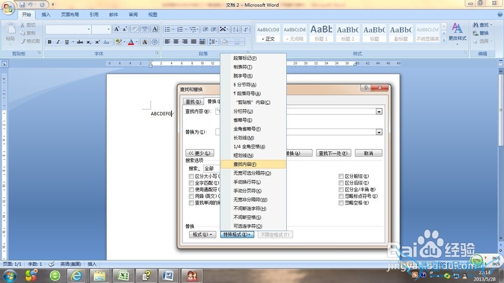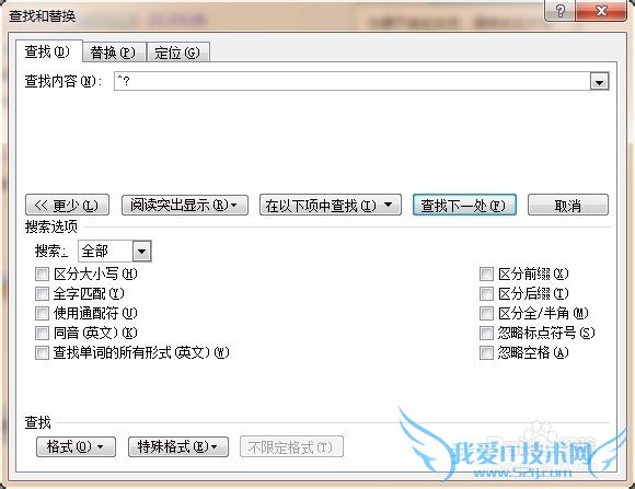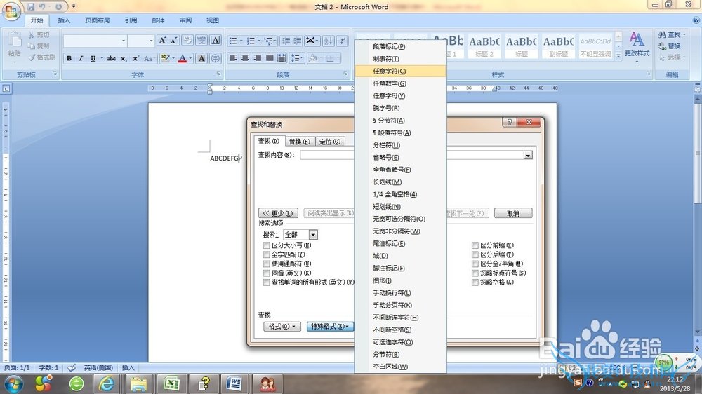 2、在“查找”框中单击“更多”按钮,弹出“更多>>”,把光标置入“查找”框内,在“特殊格式”中单击“任意字符”;