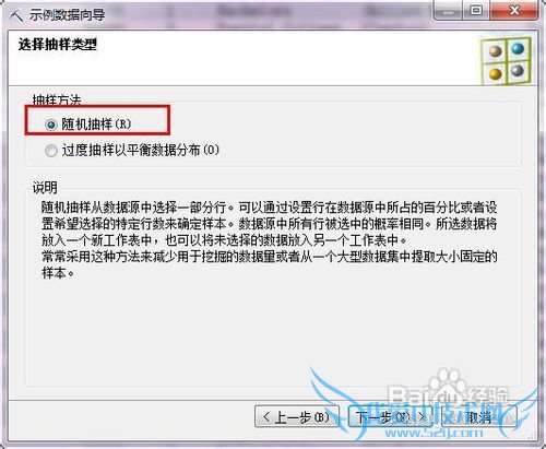 选择抽象类型,如图所示,有两种类型,一种是随机抽样,这个大家都理解,管就是过渡抽样,也就是第二个选项大家不容易理解,举一个例子,假如教师和学生的理论比例是1:30,但是我们的数据不满足这个比例,这可能是抽样误差造成的,为了满足1:30的比例,我们选择过渡抽样,一般我们都是选择第一个,点击下一步