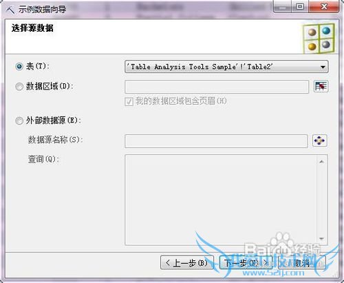 设置数据源,也就是我们要分割什么数据,这里选择默认的表格,点击下一步,如果你的数据在数据库中,可以选择外部数据,然后写上查询语句