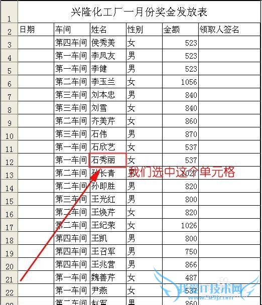 选中要设置字体格式的单元格,如果要对整个excel表格进行设置,就选中整个表格。在下图中,我们选中的是“石秀丽”这个单元格。