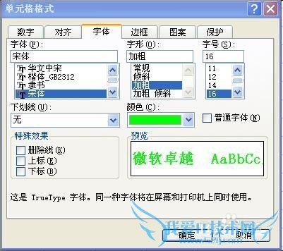 这时,会弹出“单元格格式对话框”,点击“字体”选项卡,里面会出现“字体”“字形”和“颜色’”的选项。在“字体”列表框中选择“宋体”,在“字形”列表框中选择“加粗”,在“字号”列表框中选择“16”,在“颜色”下拉列表中中选择“绿色”。