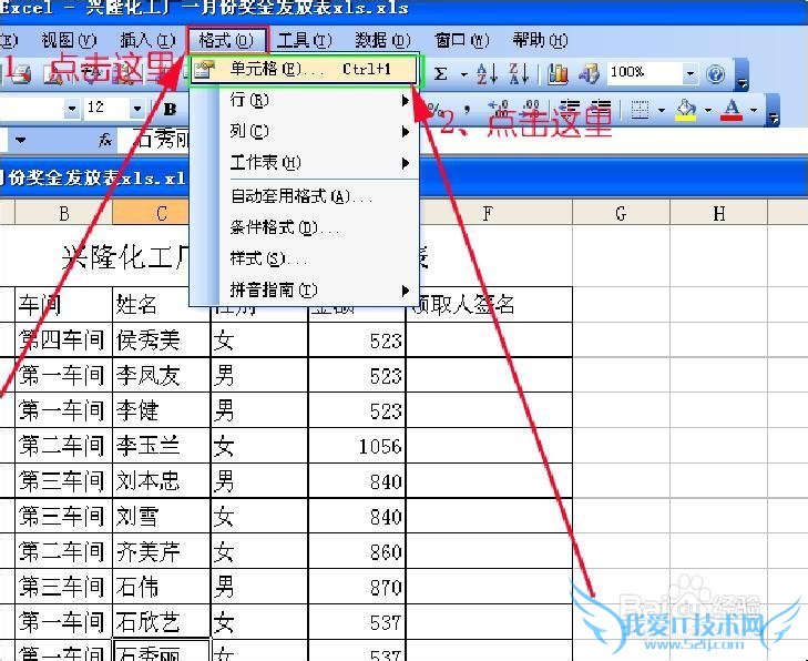 点击excel上面菜单栏中的“格式”,在下拉菜单中点击“单元格”。