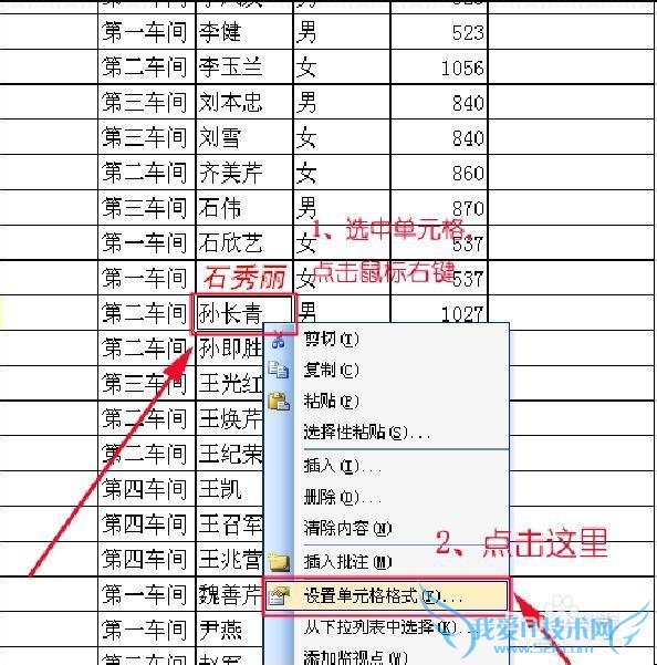 我们也可以用另一种方法。例如,我们先选中“孙长青”这个单元格,然后在上面点击鼠标右键,在弹出的下拉菜单中选择“设置单元格格式”