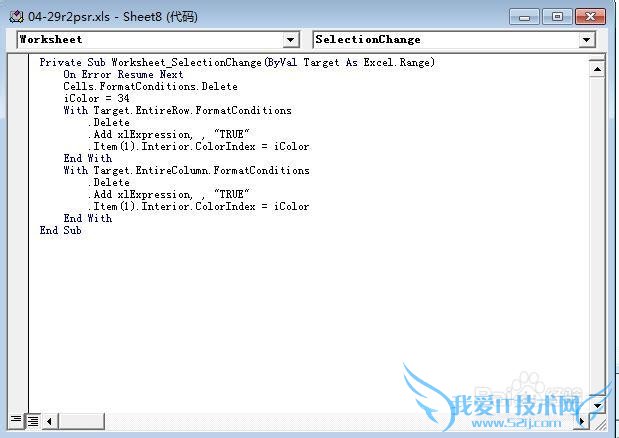 Private Sub Worksheet_SelectionChange(ByVal Target As Excel.Range) On Error Resume Next Cells.FormatConditions.Delete iColor=34 With Target.EntireRow.FormatConditions .Delete .Add xlExpression, , "TRUE" .Item(1).Interior.ColorIndex=iColor With With Target.EntireColumn.FormatConditions .Delete .Add xlExpression, , "TRUE" .Item(1).Interior.ColorIndex=iColor With Sub