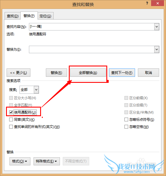 勾选 使用通配符 之后,点击 全部替换 :
