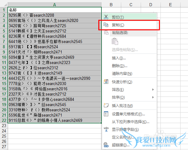 选择A列所有数据,然后右击,选择 复制 :