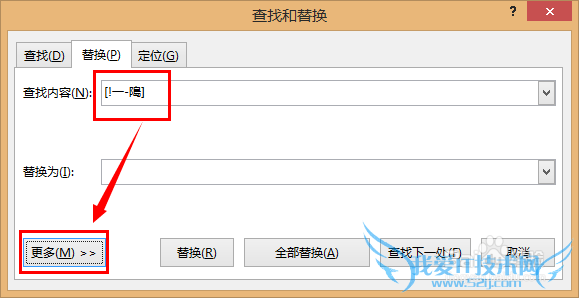 在查找内容位置输入 [!一-﨩] ,然后点击 更多 :