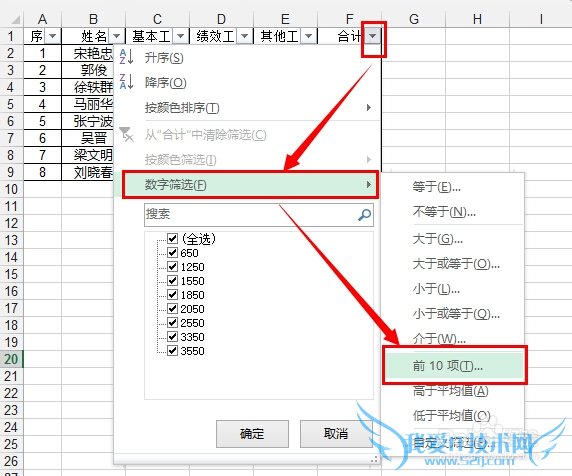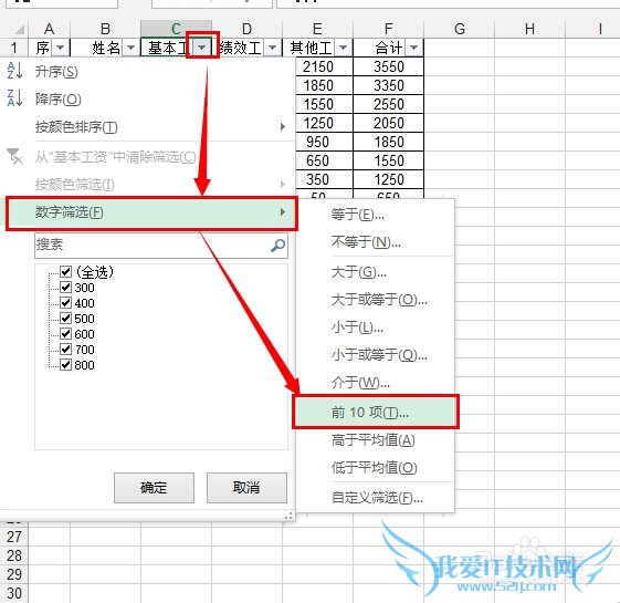 点击 基本工资列 后面的筛选按钮,然后选择 数字筛选,前10项 :