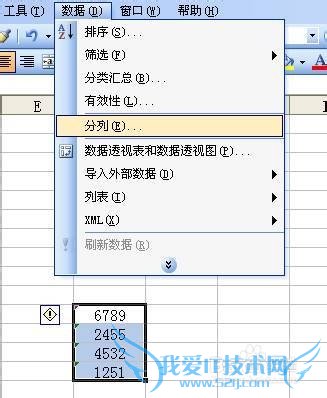 先选中所有要修改的文本数字单元格→选择Excel 菜单中“数据”菜单→“分列”(如下图)