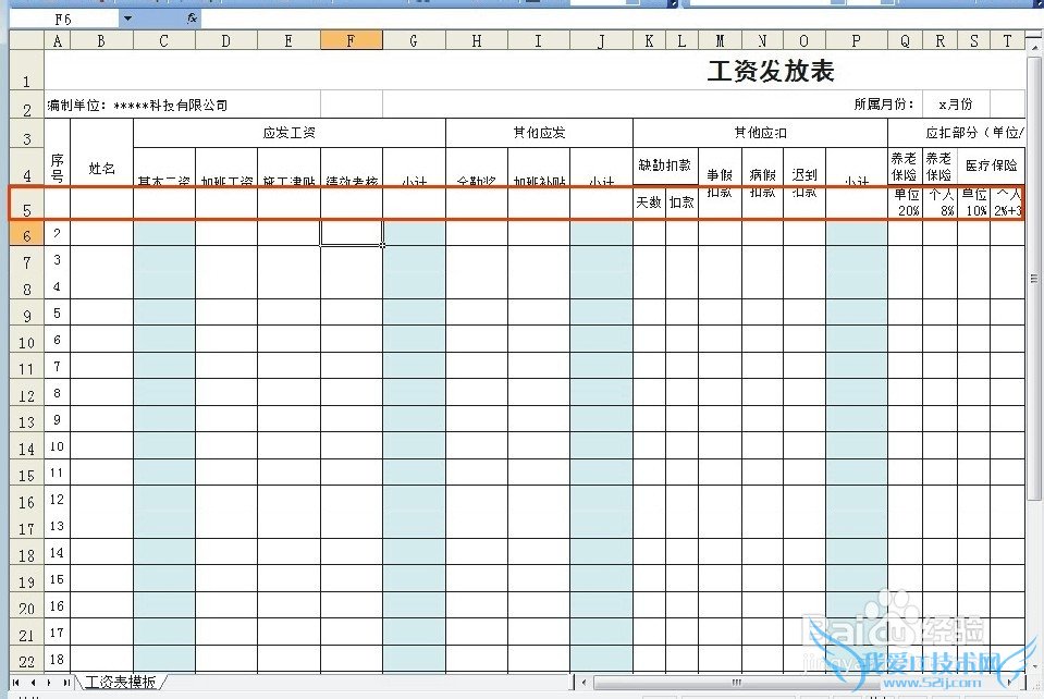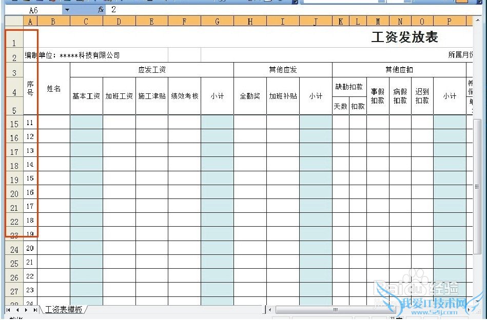 往下拉页面就会发现第5行以上的内容都被冻结了,