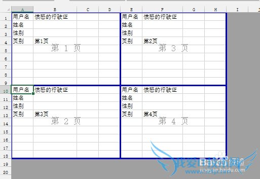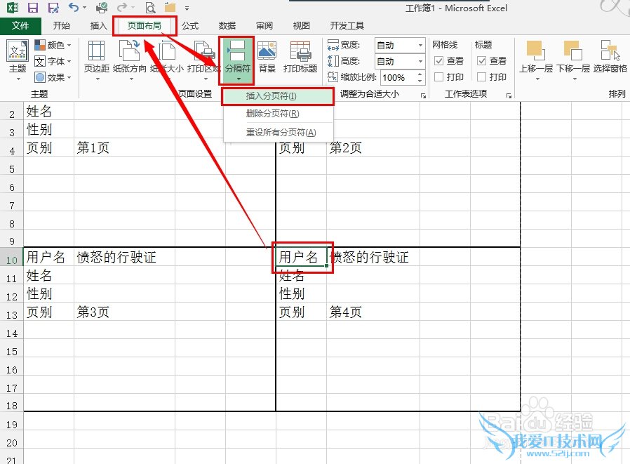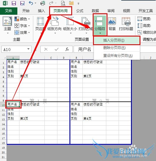 对于需要田字形分页的文档,鼠标点击第4页的左上角第一个单元格,然后依次点击 页面布局,分隔符,插入分页符 :