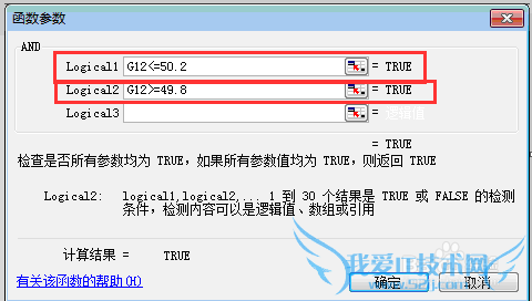 在又弹出的菜单中的“Logical1”中选择相关单元格(如本例中为G12),然后再手动输入“<=50.2”。再在“Logical2”中选择相关单元格(如本例中为G12),然后再手动输入“>=49.8”。如下图所示。需要注意的是,有时候想输入“<”,出来的却是“《”,这时候只需要切换输入法即可。