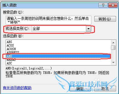 在弹出的窗口中,“或选择类别”中选择“全部”。在“选择函数”中选择“AND”。如下图所示。点击“确定”按钮。