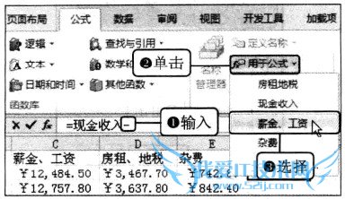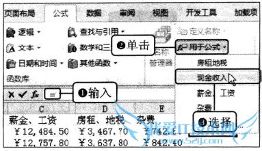 选择单元格F2,在“编辑栏”中输入“=”,然后在“公式”选项卡的“定义的名称”组中,单击“用于公式”按钮,在弹出的下拉列表中选择“现金收入”选项。
