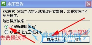 二、这时,会出现一个对话框,选择“扩展选定区域”,再点击“排序”。