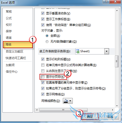 弹出“选项”窗口,我们点击“高级”,去掉“显示分页符”复选框。最后按下确定键。看图: