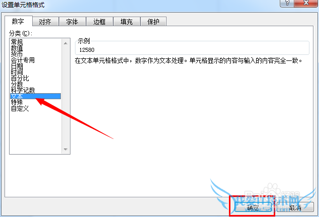 在打开的窗口中,将“数字格式”设置为“文本”,并点击“确定”按钮。