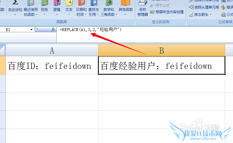 接着我们在A1单元格中输入“百度ID:feifeidown”,然后在B1单元格中输入公式【=REPLACE(A1,3,2,"经验用户")】并按回车,即可得结果。该公式的作用是从旧字符串的第三个字符(汉字也算一个字符)起,将旧字符串中连续两个字符用新字符替换。
