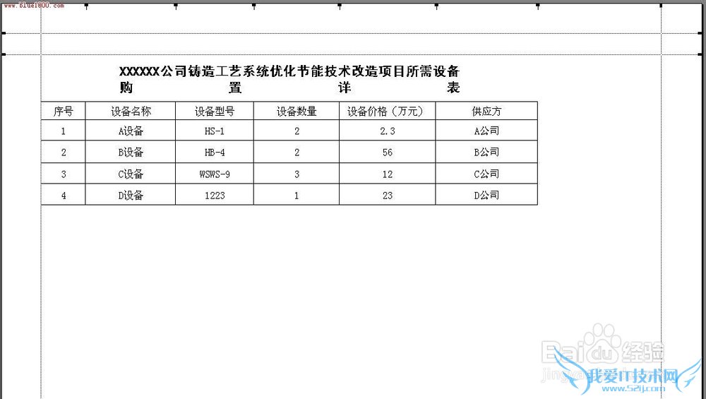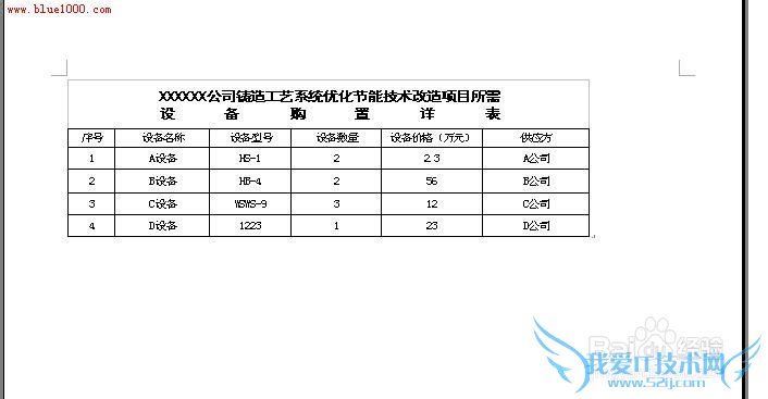 8.如果需要将此表插入到word文档以便其他使用,也很简单。先将刚做好的Excel表格保存为一个文件名《设备表》到桌面上。将此页的页面设置成横 向,否则表格会显示不全的。在Word文档中需要插入的地方,点击一下鼠标,然后选择上面“插入”---“对象”——“由文件创建”,然后找到刚刚保存的 《设备表》,插入,确定,然后就插入到Word中了。效果图如下: