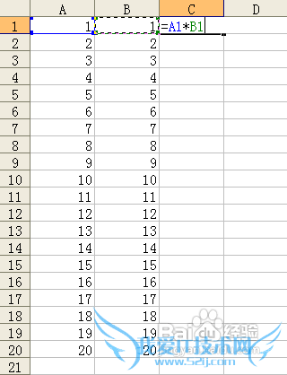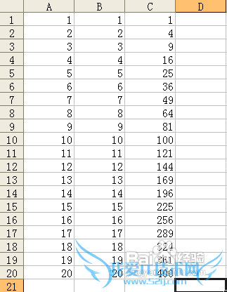 最后沿C1右下角向下拉,拉至C20,则1至20的平方则全部算出,如下图所示:
