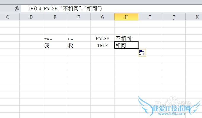 为了计算或者统计的需要,我们也可以设定判断结果的输出形式,例如我们可以设定,假如判断结果是true,我们就在H列输出“相同”,反之”不相同”