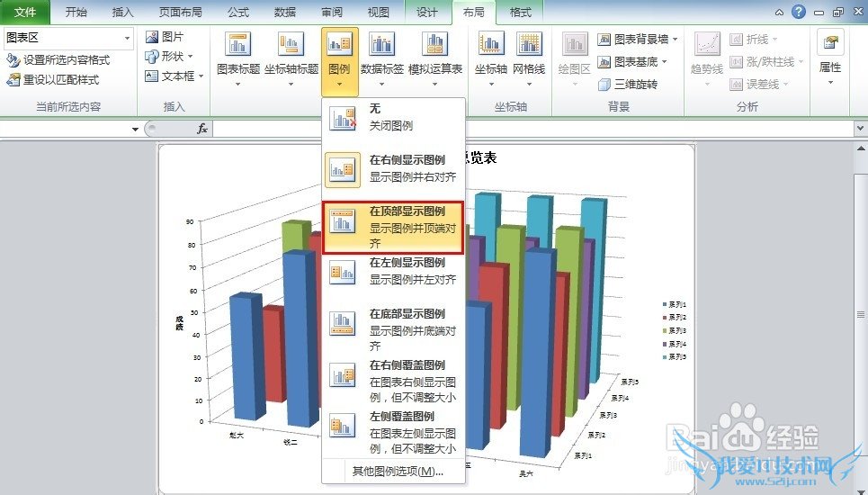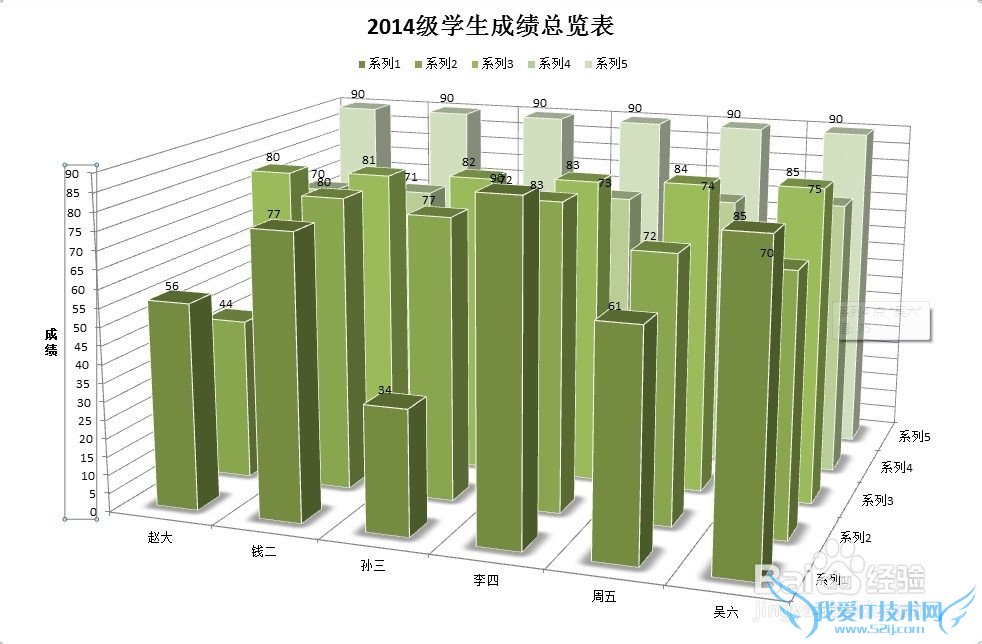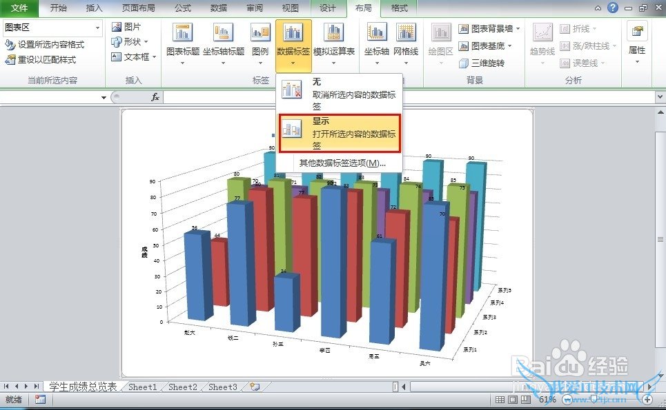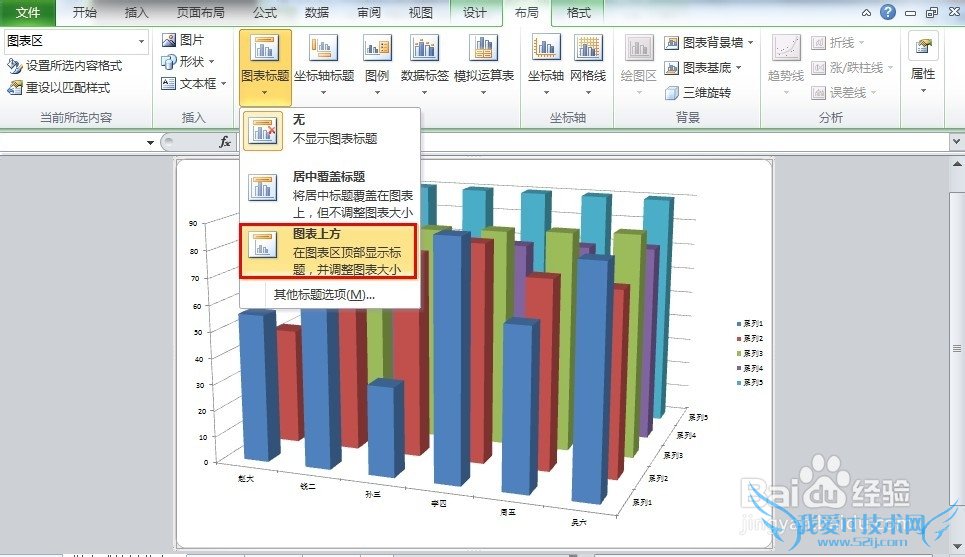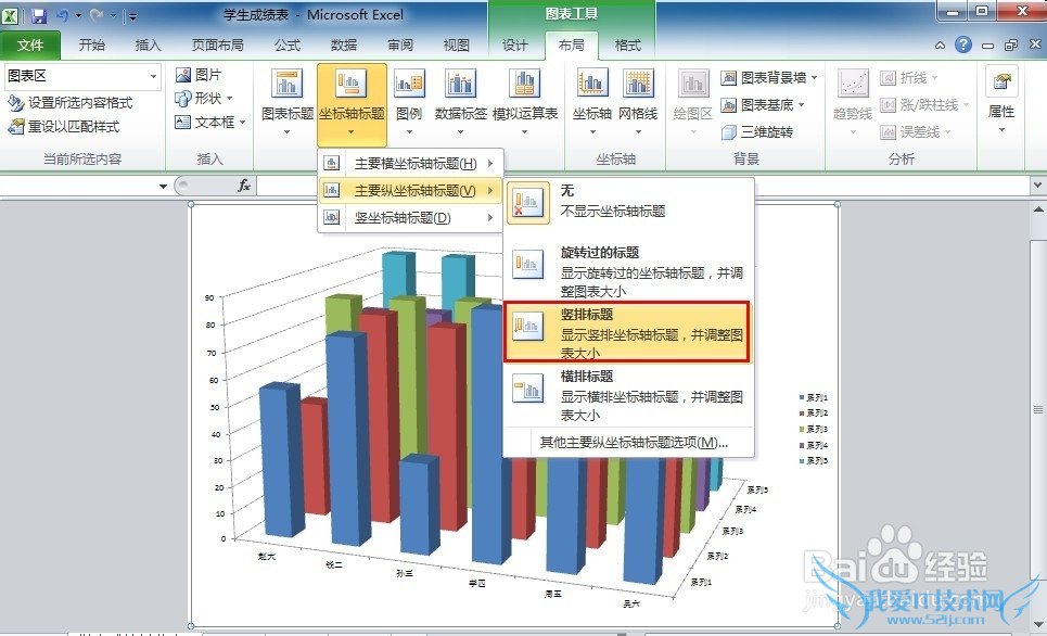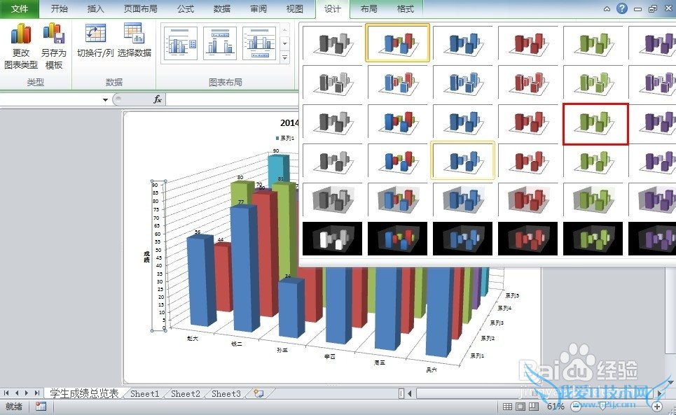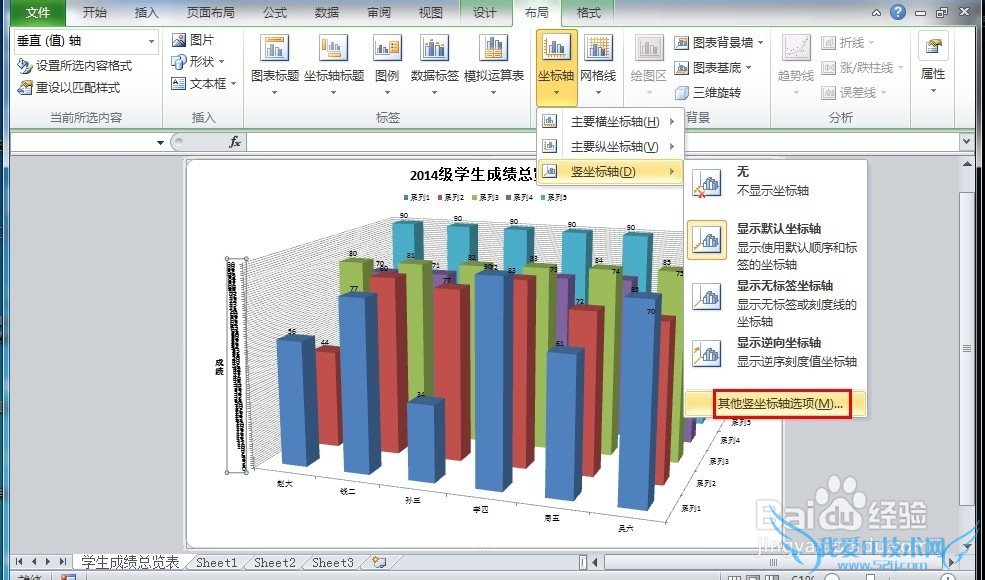 (1)在柱形图上方添加标题,“布局”选项卡下单击“图表标题”按钮,选择“图表上方”,在弹出的输入框中输入表名“2014学生成绩总览表”