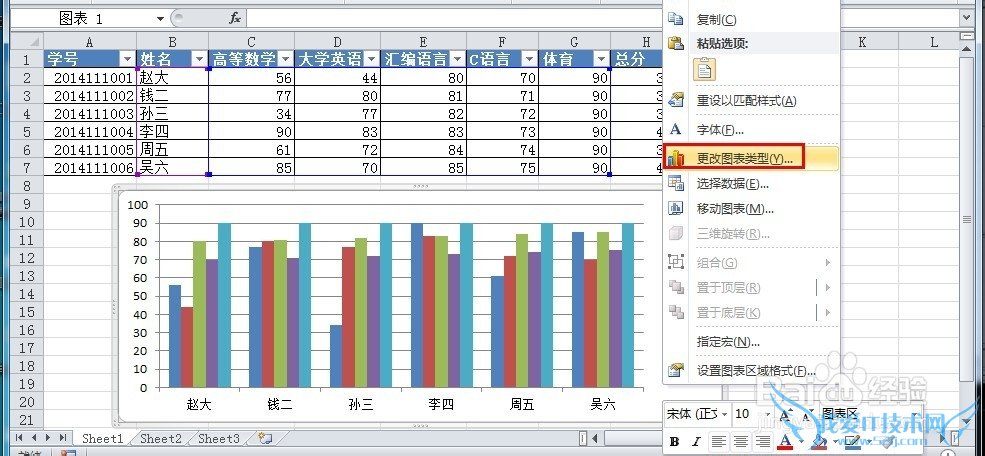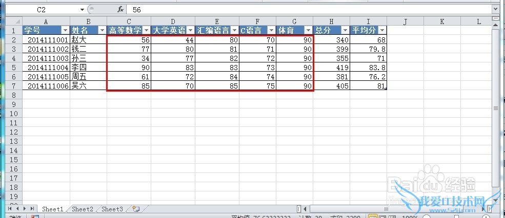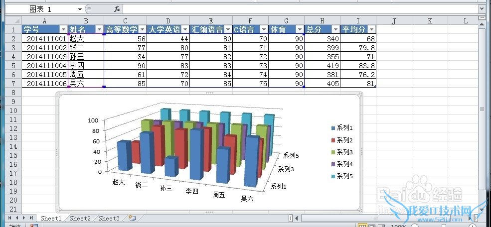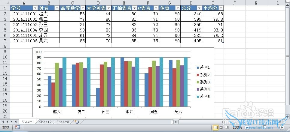 我们以下图学生成绩作为模板,用各科成绩作为图标数据