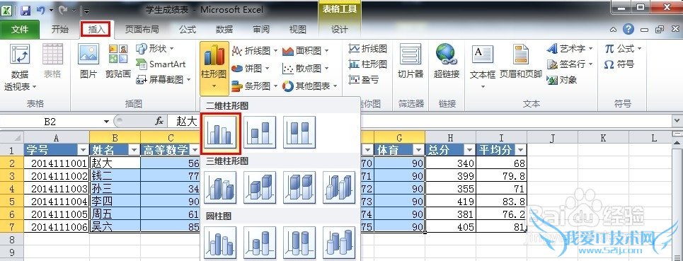 选中表中B2到G7的表格,单击“插入”选项卡下的“柱形图”按钮,选择“簇状柱形图”