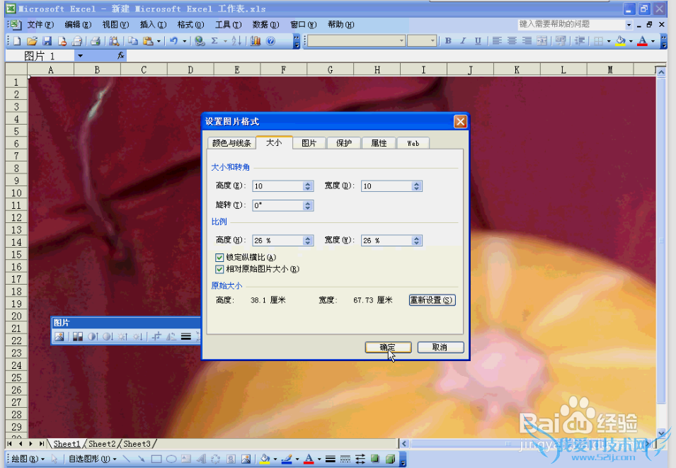 3.如果插入的图片过大,可以双击鼠标左键,在如图的对话框中选择大小修改图片的高度和宽度