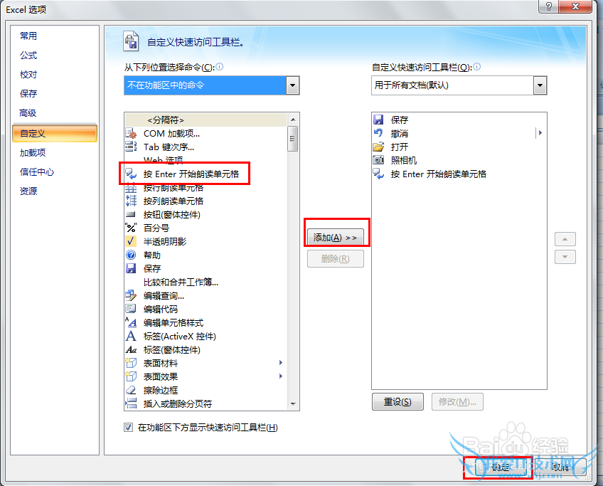 第七步:找到按enter开始朗读单元格,点击后按添加选项,最后按确认键。在空白单元格后就会出现该功能键的快捷键,如图: