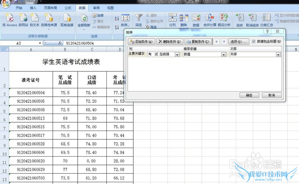 第二步:假如,我想要按照考试总成绩从小到大排序,要如何操作呢?你先框选住想要排序的内容,记的标题不用框选进去。然后点击数据菜单,选择排序和筛选,选择排序。