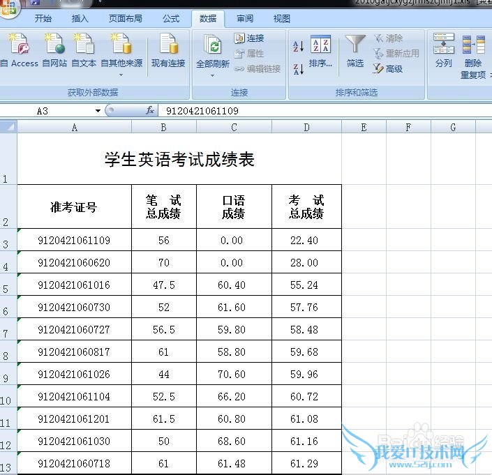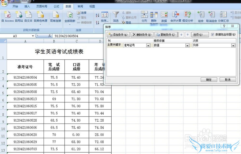 第一步:先在表格中编辑好内容。如下图,这是按准考证号进行从小到大顺序的。