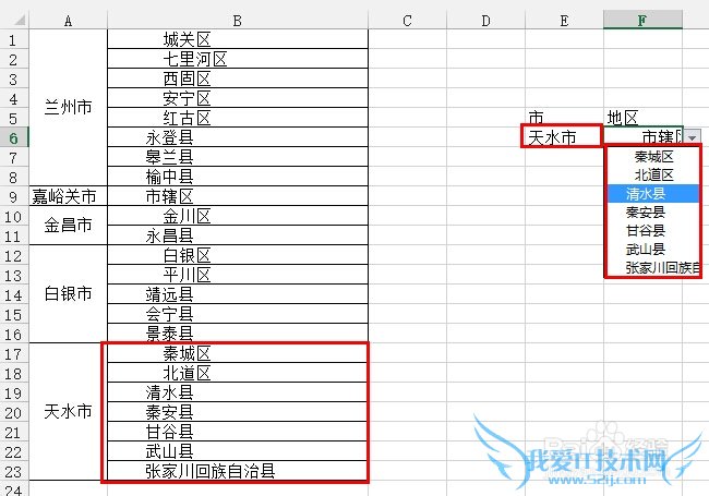 而在市下面单元格选择天水市之后,地区下的区名只能选择天水市下的地区了: