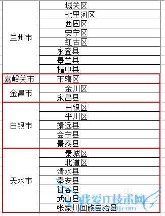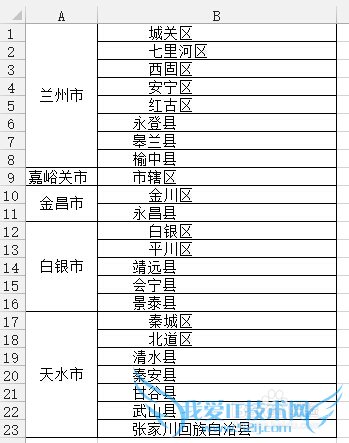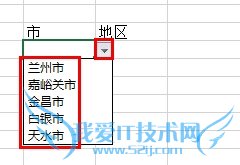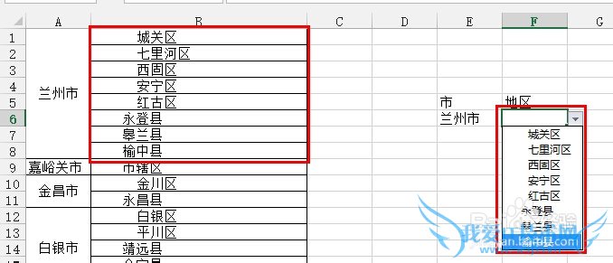 如下图所示,在市下面单元格选择兰州市之后,地区下的区名只能选择兰州市下的地区了: