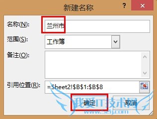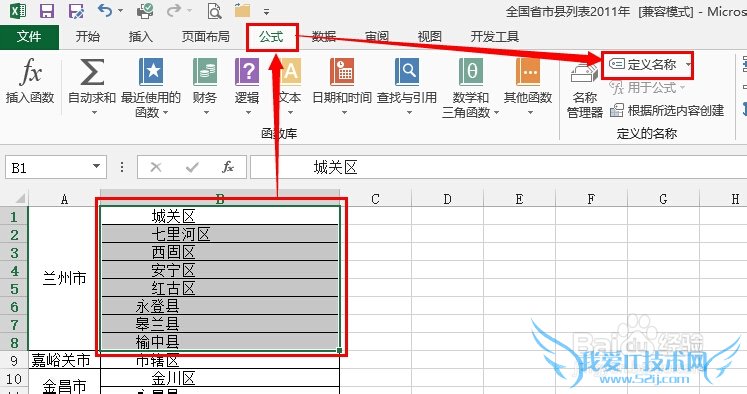 选择兰州市的所有地区名,然后依次点击公式,定义名称: