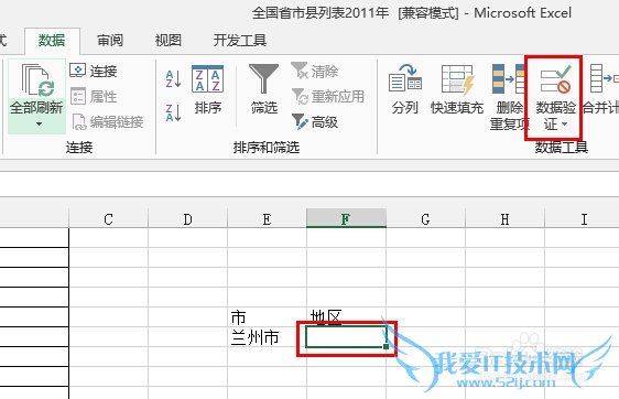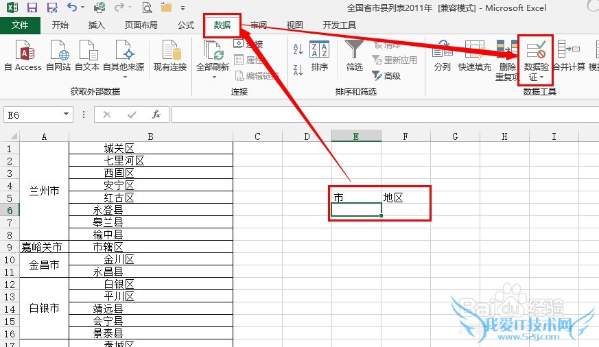 在Excel空白位置输入市和地区,然后选择市下面的单元格,依次点击数据,数据验证(07版本选择数据,数据有效性):