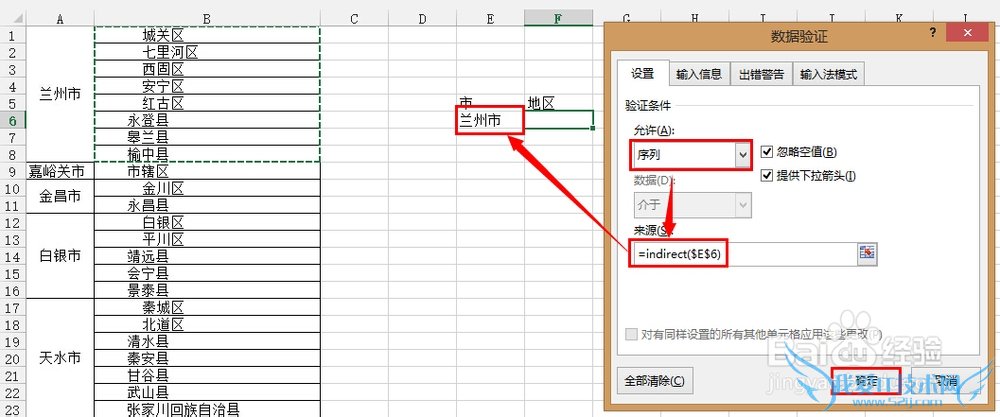 允许位置选择序列,在来源位置输入公式 =INDIRECT($E$6),其中,$E$6是市下面的那个单元格: