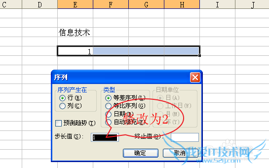 填充序列:选中要填充的单元格内容以及填充的区域,单击菜单“编辑”|“填充”|“序列”,在对话框中设置后,单击确定。
