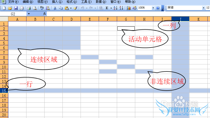 选定非连续单元格区域:选定一个单元格区域后,按住Ctrl键再选定另一个区域,重复该操作,可选定多个单元格区域。
