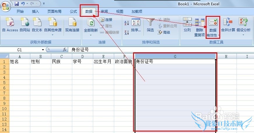 选中身份证列,然后依次单击“数据,数据有效性”: