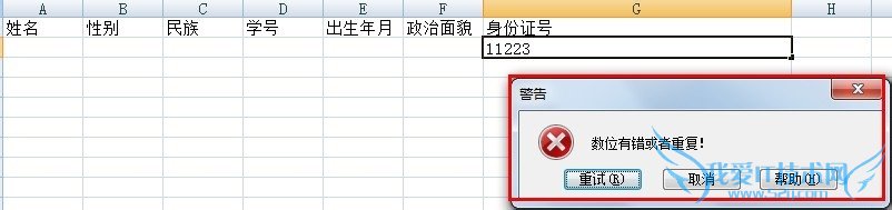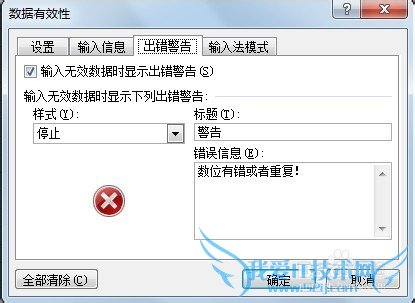 在出错警告内设置警告信息的标题“警告”,错误信息为“数位有错或者重复!”,单击“确定”: