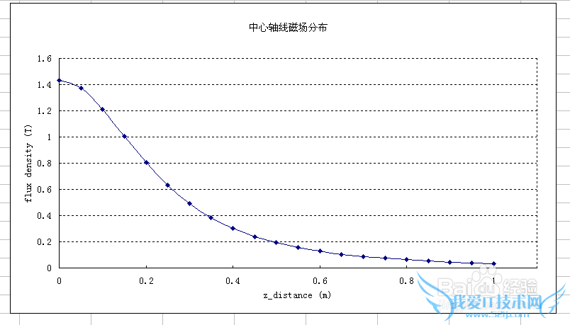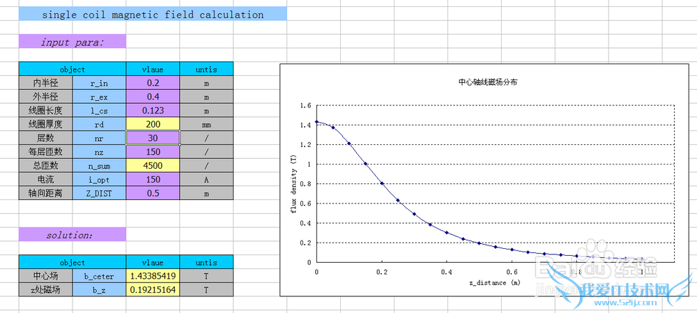 2、本文采用excel编辑,可以很方便的快速得到中心场及轴线某点处的磁场,并给出中心轴线上的磁场分布。