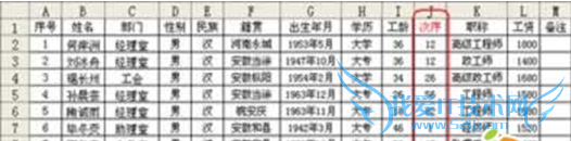 有时,我们对某些数值列(如“工龄、工资”等)进行排序时,不希望打乱表格原有数据的顺序,而只需要得到一个排列名次。对于这个问题,我们可以用函数来实现(以“工龄”为例):在“工龄”右侧插入一个空白列(J列),用于保存次序(图6),然后选中J2单元格,输入公式:=RANK(I2,$I$2:$I$101),然后再次选中J2单元格,将鼠标移至该单元格右下角成“细十字线状”时(这种状态,我们通常称之为“填充柄”状态),按住左键向下拖拉至最后一条数据为止,次序即刻显示出来。