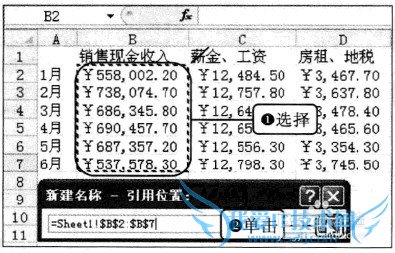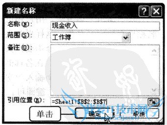 返回工作表中,选择B2:B7单元格区域,可以在名称框中看见定义的名称“现金收入”。